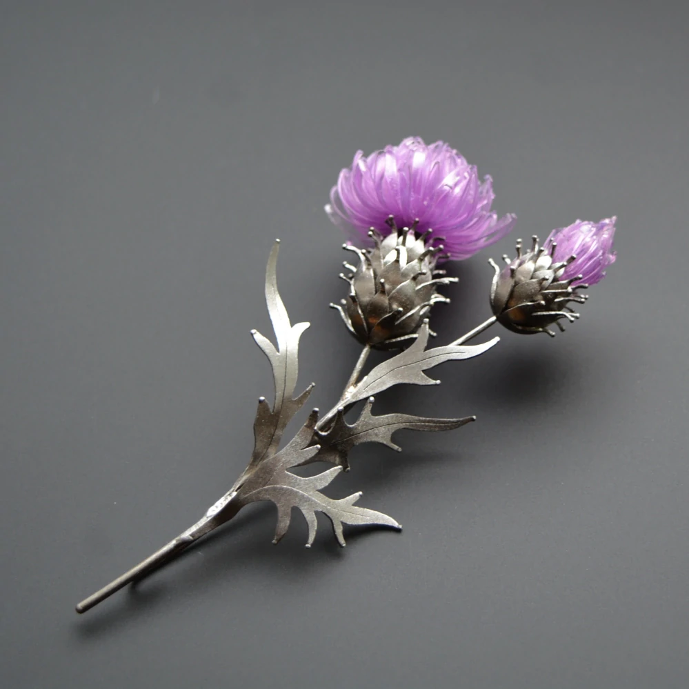 Brož je vytvořena z nerezové oceli, barevné části jsou z recyklovaných PEt lahví. Dělka brože je 10 cm.